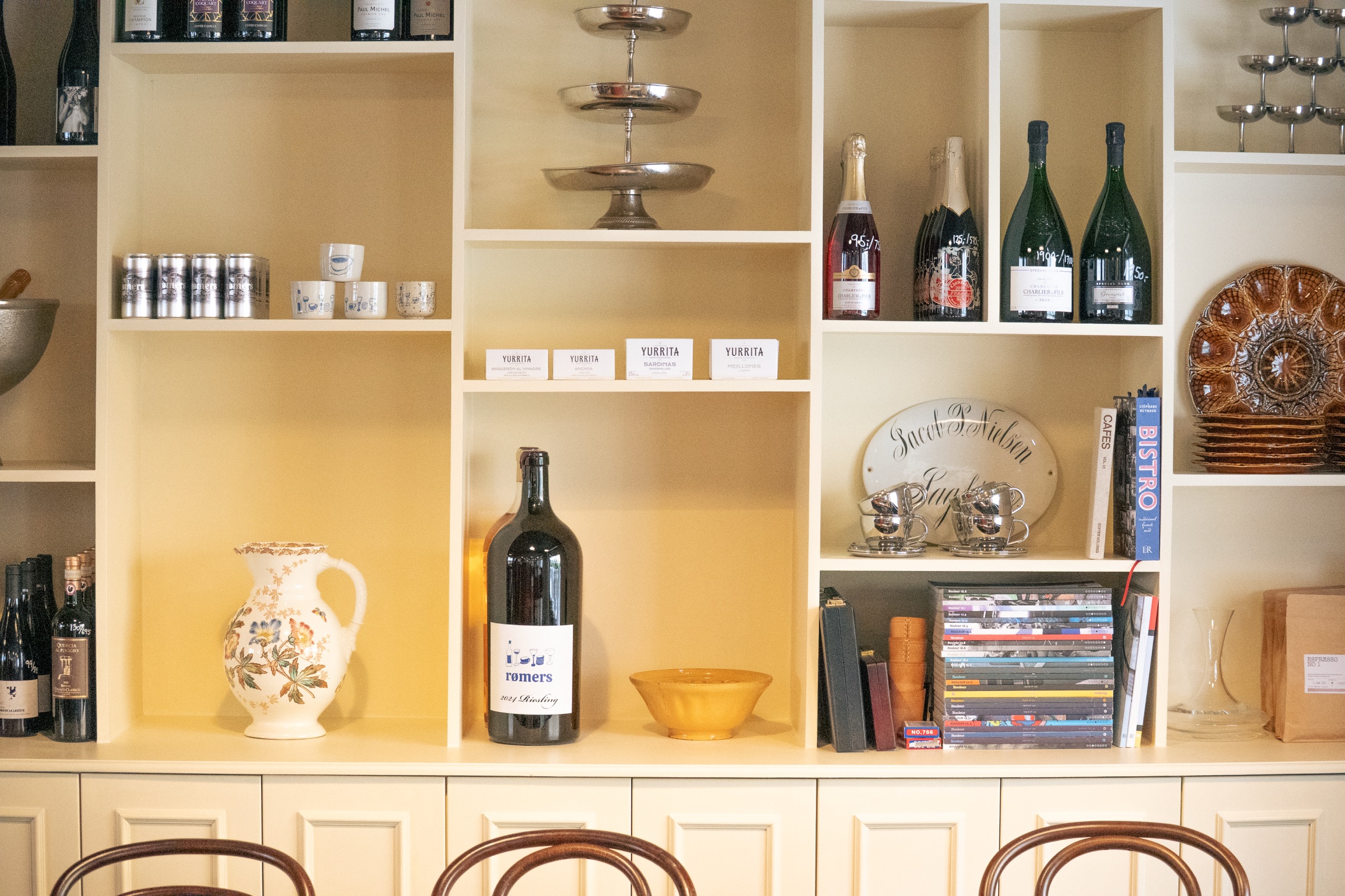 Lokalet var tomt da vi overtog det. En blank side — og præcis hvad vi havde brug for. Vi byggede det op nøjagtig som vi ville have det. Emma fandt sin plads helt naturligt, sådan som hun altid gør. Og brødrene tager sig af alt det digitale — Instagram, hjemmesiden, det hele. Er du heldig, laver de også en kop kaffe.